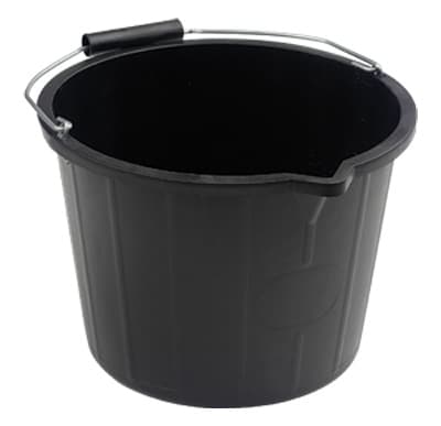 A builder's bucket is a 3 gallon (15lt) black heavy duty bucket with pouring spout.