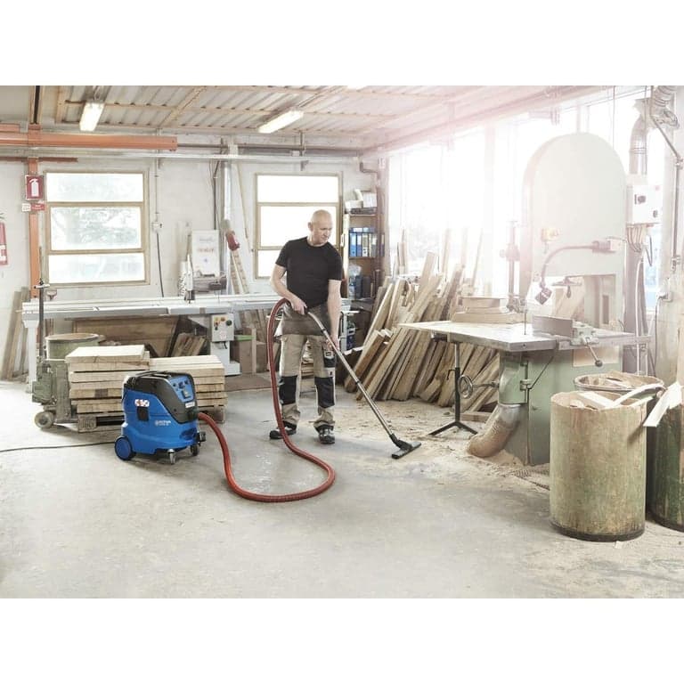 The vacuum’s 42 L impact-resistant container offers ample capacity for dust, debris, and liquids, while the compact, lightweight chassis and large rear wheels make it easy to transport between job sites. The anti-static system prevents static build-up when connected to power tools, and the power take-off socket allows automatic start/stop functionality for seamless tool integration.
