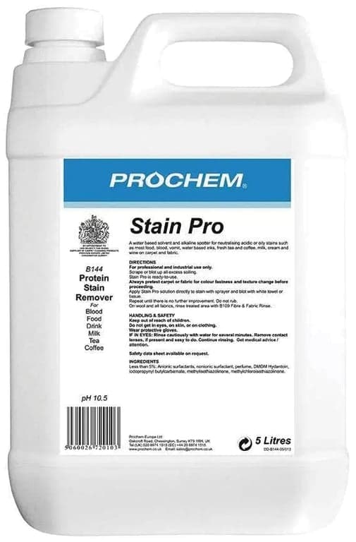 Prochem Stain Pro is a heavy duty water and solvent based alkaline protein spotter for blood, vomit, wine, ink, fresh tea, coffee and most other food based stains. It is a clear liquid with mint fragrance.